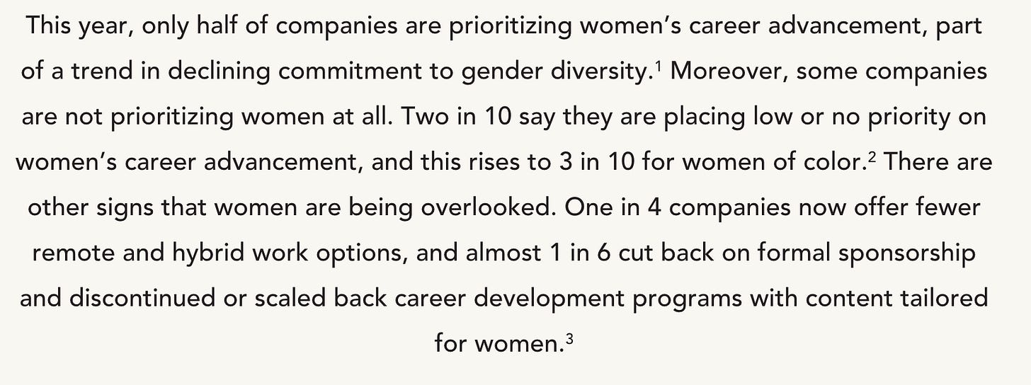 Bloomberg reported last week that the inclusion of women in the C-suite had stalled this past year, and so did that ghastly predatory outfit McKinsey, which partnered with former Facebooker, Sheryl Sandberg’s equally grisly Lean In operation. They claimed women have lost a decade of progress in just one calendar year. Which is a feat, admit.
